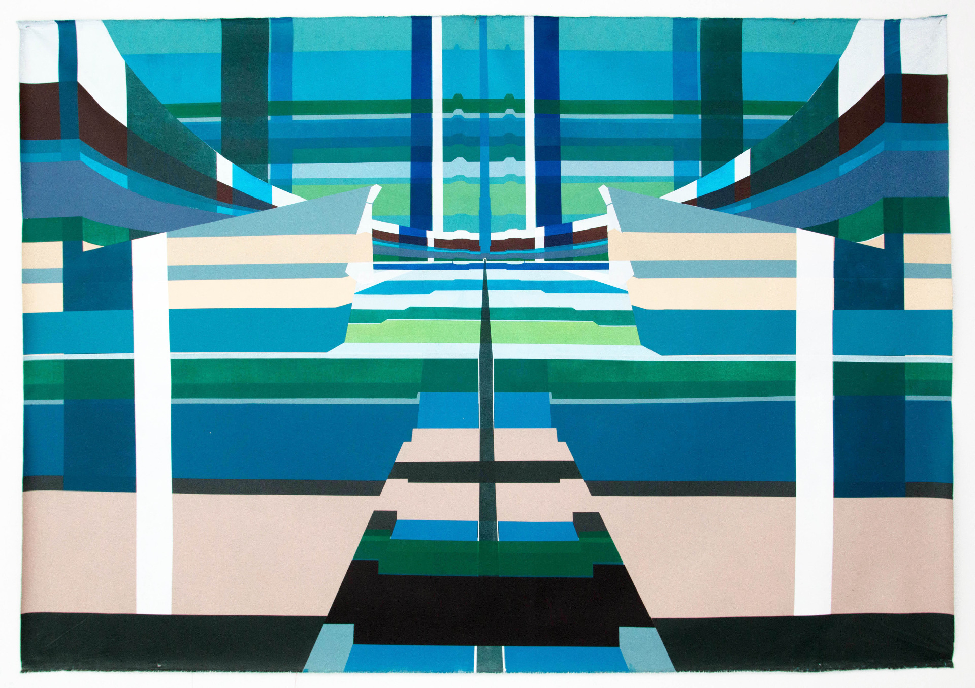 J'observe dans la composition de la musique techno, où les sonorités sont «mixées» comme les architectures que j'étudie : un métissage et une hétérogénéité des formes et des origines culturelles et sociales. Ainsi je ne participe plus à parler du religieux, du sacré ou du politique. Mon travail trouve dans l'usage de ces constructions un rapport pré-existant à une géométrie qui investit l'espace. La mise à plat de ces constructions par la photographie ou le dessin m'amène à produire les lignes qui me serviront à poser sur la toile, nouvel espace bidimensionnel, une superposition de bandes colorées selon des nuances déterminées en amont. Ce motif simple, les bandes, révèle l'espace architectural par la couleur sans en représenter les lignes sinon par sa déformation. Le protocole que j'ai établi afin de produire ces peintures démarre systématiquement par une phase d'observation d'architectures existantes. Mon intérêt se focalise vers différents courants : le brutalisme et le classicisme, le néo-classicisme ou les constructions pré-coloniales et toutes celles qui par leur monumentalité ou leur géométrie m'interpellent.