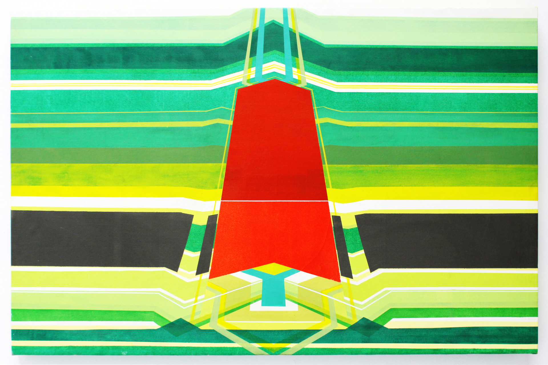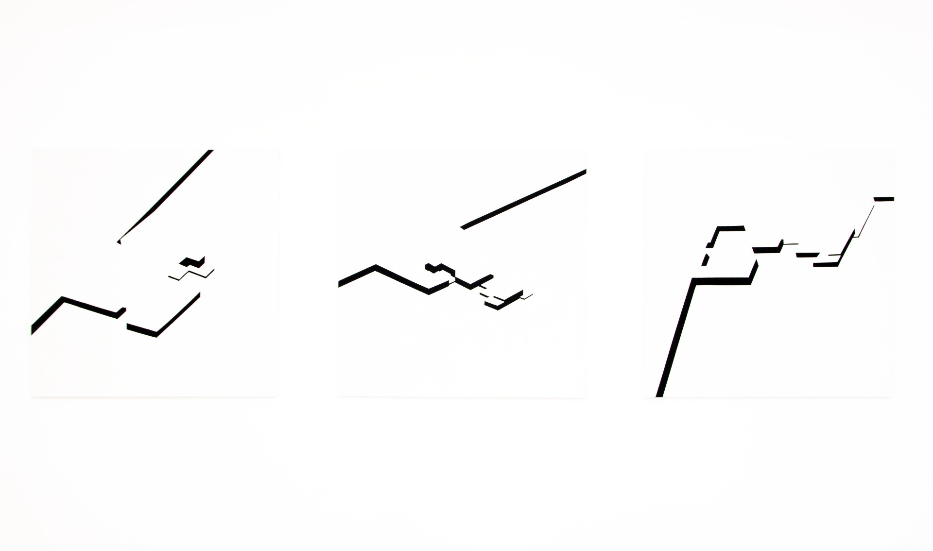 Ces peintures suggèrent, grâce à la couleur, la déformation d'un motif sur l'espace plat de la toile selon une forme habitant l'espace. Cette forme provient d'une composition de différentes architectures pré-existantes d'origines culturelles et d'époques différentes. Ces bâtiments ont été, par exemple, construits pendant l''ère soviétique ou l'époque post médiévale en Occident, ou bâtis par les peuples natifs d'Amérique. Ils fixent l'attention sur un axe ; tout comme les surfaces de couleurs, la symétrie de ces architectures absorbe le regard. J'ai choisi d'étudier le travail de Georges Adilon, peintre et architecte. Il crée sur de très grands formats des espaces d'ombre et de lumière. Ces peintures contraignent les formes de ses architectures à concevoir. Voulant établir un lien plus fort avec ce qui constitue l'essence de mon désir à peindre. J'ai réalisé plusieurs monotypes, ajoutant entre la matrice et la feuille quelques modules de papier. En modifiant la position de ces modules une fois l'impression réalisée, j'ai pu imaginer les différents étages d'une architecture simple. J'en ai réalisé la maquette en terre. J'y ai projeté un motif : une bande. J'ai ainsi pu observer de façon efficace sa déformation selon les formes de l'architecture. Lignes noires sur fond blanc découlent de ses observations : elles sont la représentation selon différents points de vue de la déformation du motif sur l'espace plat de la toile. La peinture devient le témoin de la déformation de l'espace que produisent les structures utilisées. Dans l'ensemble ces tableaux semblent suivre la voie de l'abstraction géométrique dans une recherche par l'image de ce que peuvent traduire les constructions humaines.