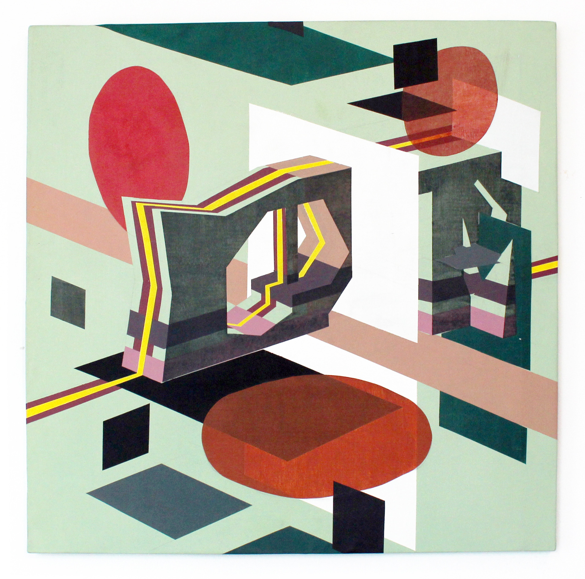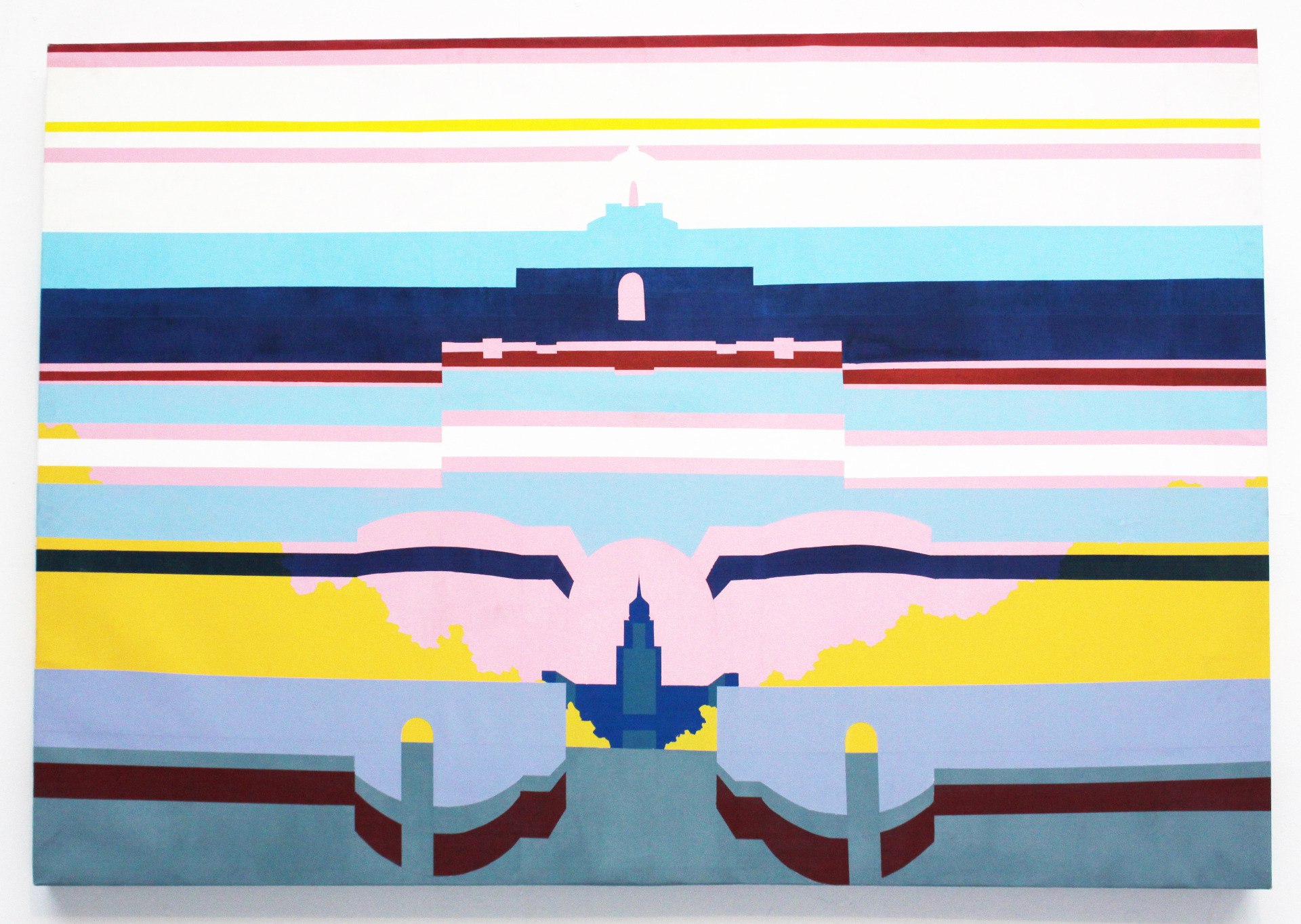 Ici se rencontrent le parc de Treptower : mémorial soviétique situé à Berlin, le musée d'anthropologie de Mexico, l'hôtel d'Olonne de l'école des beaux-arts à Angers et la cathédrale de Lyon. Je me suis intéressé aux formes géométriques de ces constructions que j'ai recomposées dans un nouvel espace vierge grâce aux rapports de contraste et d'harmonie qu'entretiennent certaines couleurs.